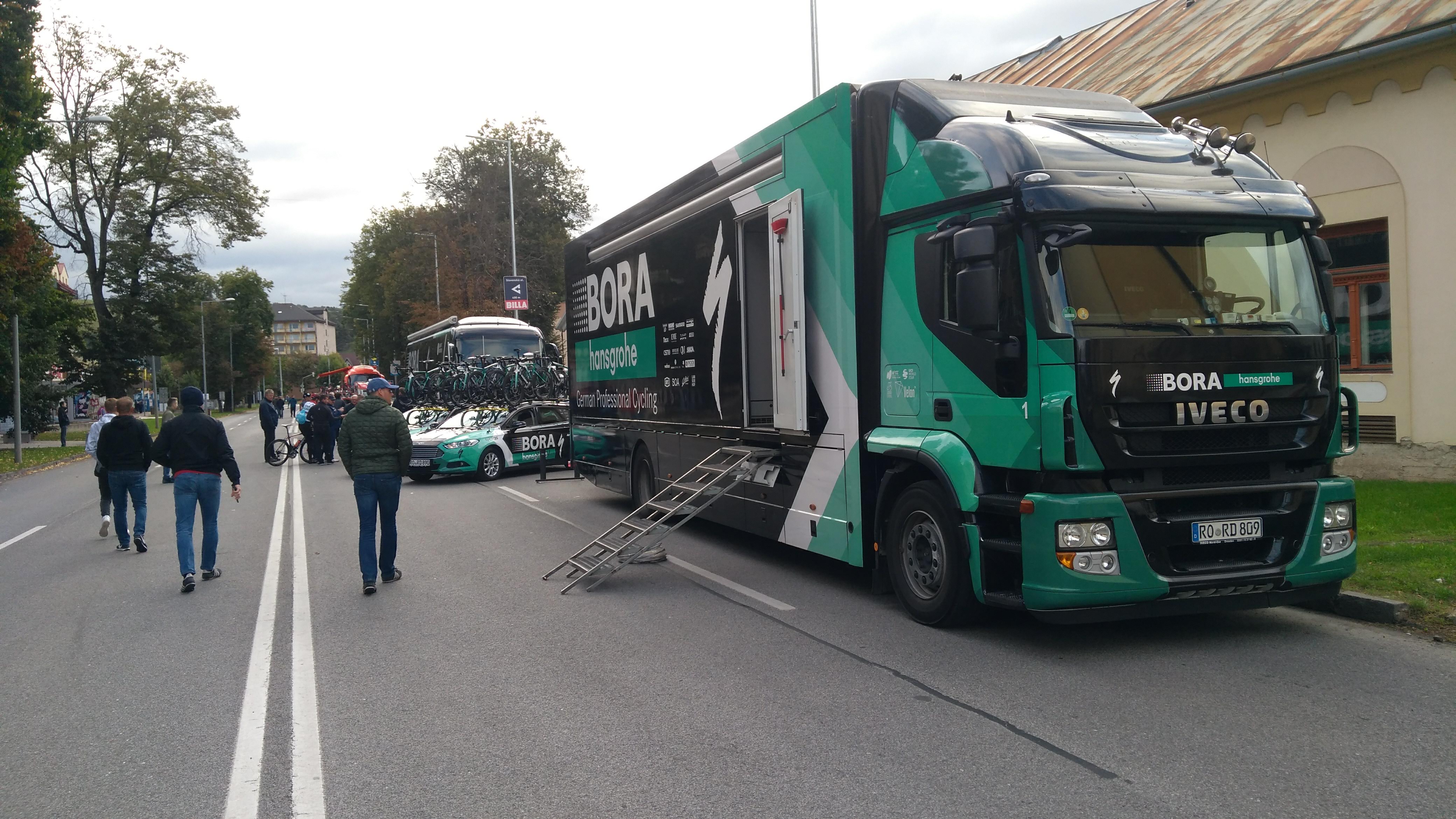 Plní vzrušenia sme čakali na prvých cyklistov, zatiaľ čo technici tímov pripravovali ich bicykle. Samozrejme, že ako prvý autobus tímu, pri ktorom sme sa zastavili, nebol žiadny iný než tím Bora-Hansgrohe. Prekvapilo ma, koľko Slovákov (okrem cyklistov :D) je súčasťou tímu. Technik, ktorý pripravoval bicykle, bol tiež Slovák. Rozdával cyklistické čiapky a jednu dostal aj môj brat, z čoho mal veľkú radosť.