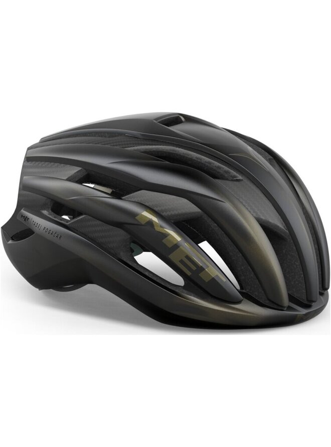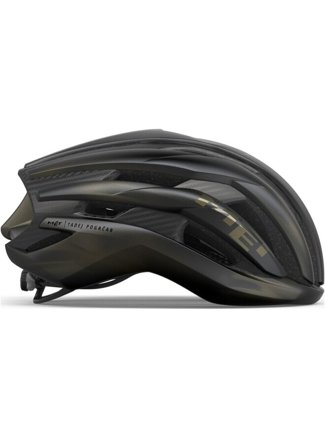 MET Trenta 3K Carbon Blačk Edition predefinuje našu najpokročilejšiu cestnú cyklistickú prilbu s novým, exkluzívnym dizajnom vytvoreným pre Tadeja Pogačara. Táto Blačkova edícia oslavuje zlatú éru súčasnej cyklistiky a jej slávnu hviezdu Tadeja Pogačara – prirodzený talent a podstatu skutočného šampióna. Jeho aerodynamický a inovatívny profil je teraz výraznejší a rafinovanejší, s jedinečnou farebnou kombináciou čiernej, ktorá symbolizuje eleganciu a autoritu, a zlatej, ktorá predstavuje sezónu plnú víťazstiev.