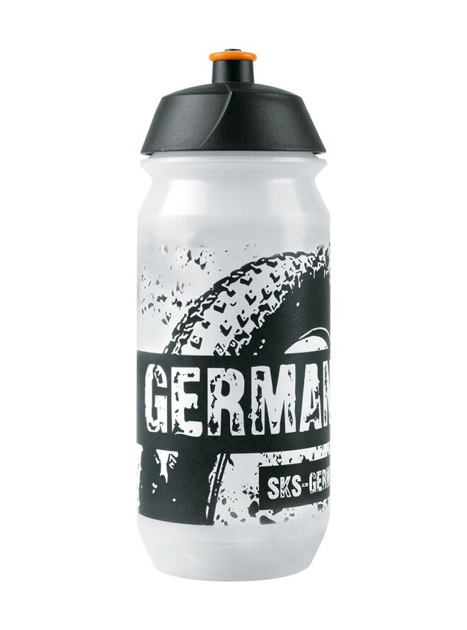 Priehľadná cyklistická fľaša SKS s logom nemeckého tímu.