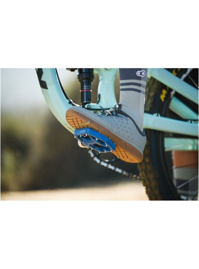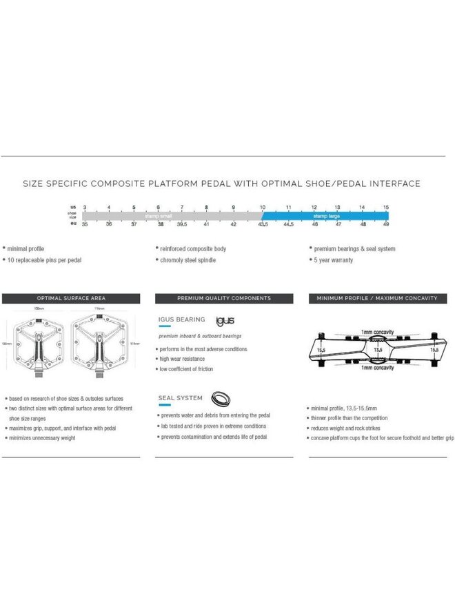 Ďalšia generácia najobľúbenejšieho platformového pedálu v Kalifornii je tu! Nové pedále Stamp 1 stavajú na odkaze celej rodiny pedálov Stamp a vyznačujú sa konkávnou platformou pre väčšiu istotu na traili, osvedčenými vnútornými komponentmi z pedálu Stamp 7 pre skvelú odolnosť a dlhú životnosť a novým jednodielnym dizajnom kolíkov pre maximálnu priľnavosť a jednoduchú výmenu kolíkov! Nová verzia pedálov Stamp 1 bola vytvorená s nekompromisným záväzkom ku kvalite a môže sa pochváliť robustným nylonovým telom a osvedčenými vnútornými prvkami z ocenených pedálov Stamp 7. Použitie: trail/enduro/freeride/DH/elektrobicykle/šport/dochádzanie Štíhly, konkávny profil - výška tela pedálu 13,5 mm až 15,5 mm Hmotnosť 321 g Telo platformy: 100 x 100 mm (topánky 35 až 43,5), výška 13,5-15,5 mm Platforma: nylonový kompozit Os: kovaná Cr-Mo oceľ Vnútorné ložisko: Igus LL posuvné puzdro Vonkajšie ložisko: Igus LL posuvné puzdro Nové jednodielne vymeniteľné kolíky, 10 kusov na pedál (vnútorný kolík výška 23 mm, vonkajší kolík výška 25 mm) Pečiatka malá odporúčaná pre veľkosti topánok: 3-10 (US M) // 37-43,5 (EU) Stamp Large odporúčané pre veľkosti topánok: 10-15 (US M) // 43,5-49 (EU)Detaily