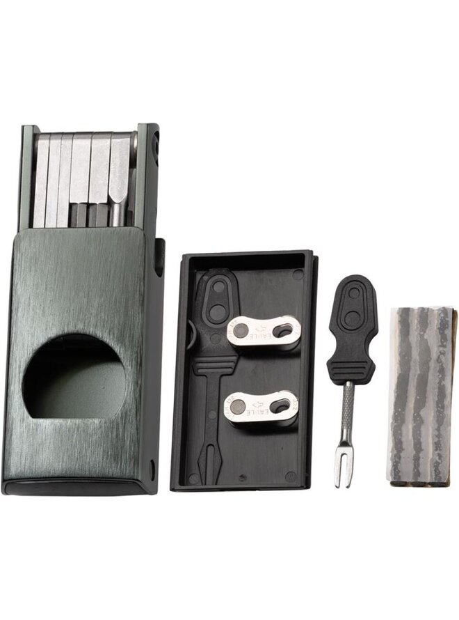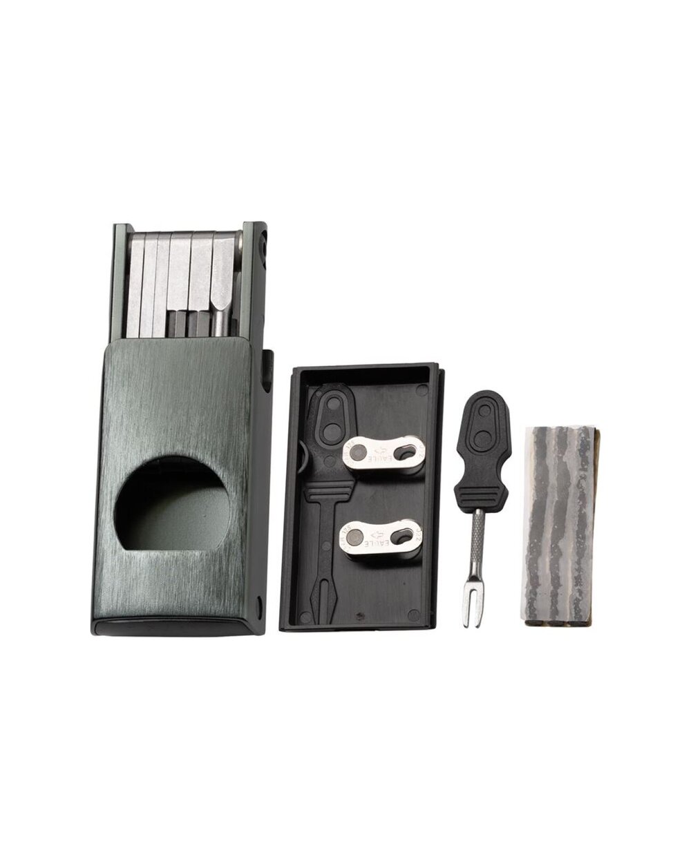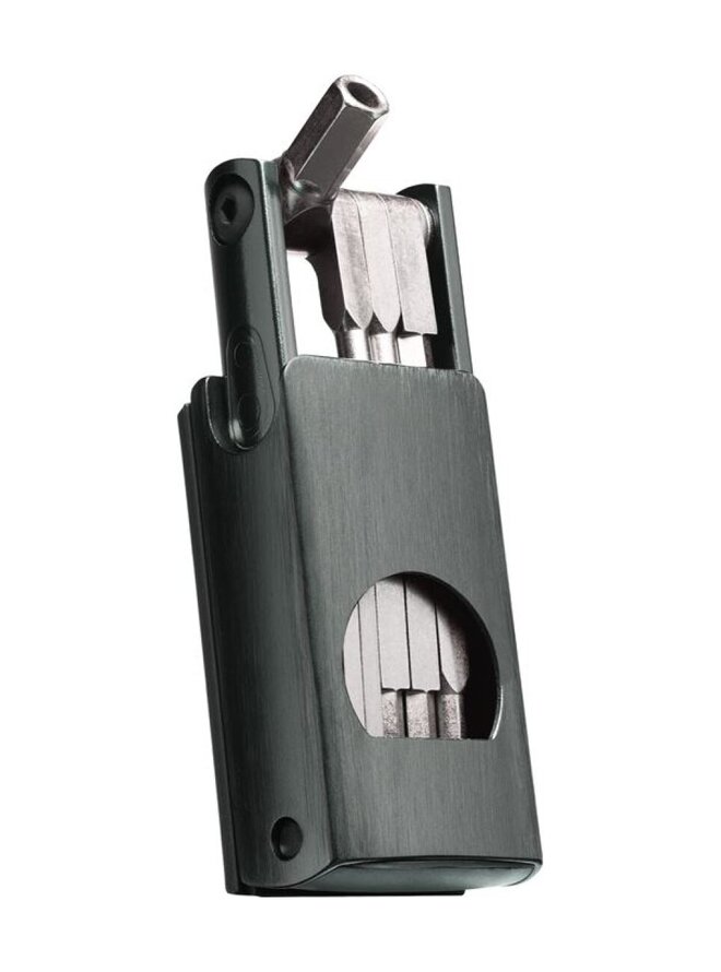 Kompaktné 11-funkčné náradie s úložným priestorom na knôty, kľúče na náradie a iné drobné predmety. Náradie uložené v luxusnom magnetickom boxe, ktorý môže slúžiť aj ako rukoväť, keď sa potrebujete do niečoho oprieť s väčšou pákou. Hmotnosť NÁSTROJE vysokopevnostná oceľ - 2 / 2,5 / 3 / 4 / 5 / 6 / 8 mm inbusy - krížové a ploché skrutkovače - kľúč T25 Torx - otvárač na fľašeDetaily