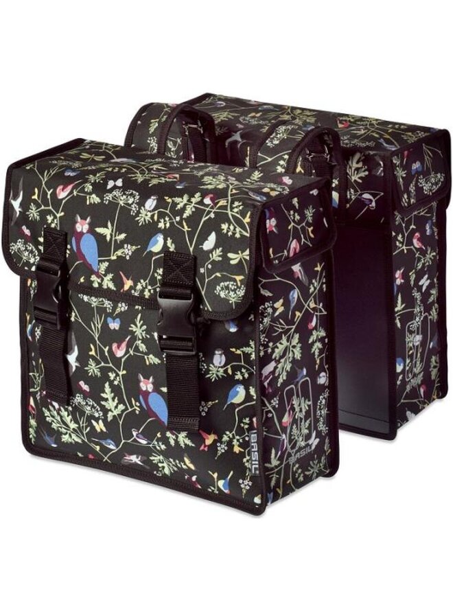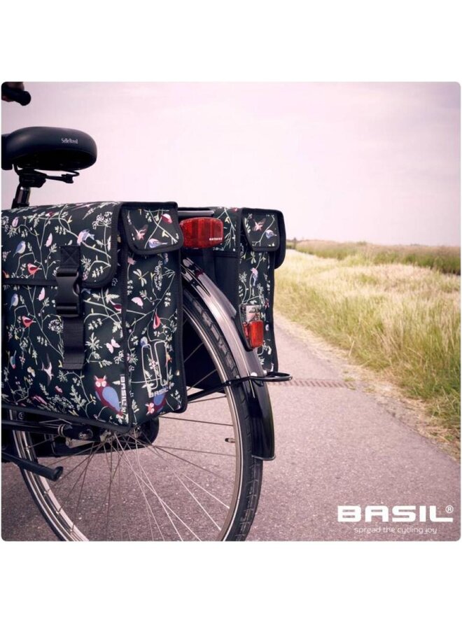 Dvojitá brašna na bicykel. Polyester s vodoodpudivou úpravou, uzatváranie pomocou praciek, pútka na vrchnej strane pre uchytenie svetla alebo detskej sedačky, dvojité reflexné prúžky z každej strany. Montáž na zadný nosič pomocou popruhov. Objem: 35 litrov. Rozmery:36 cm x 14 cm x 41 cm (vonkajšie rozmery). Nosnosť:10 kg, maximálne 5 kg na 1 brašnu.Detaily