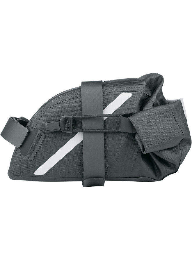Podsedlová taška SKS je vybavená skracovateľným suchým zipsom, ktorý zabezpečuje bezpečné upevnenie pod sedlo bicykla. Dve vnútorné vrecká z odolnej sieťoviny bezpečne uchovajú kľúče alebo peniaze. Reflexné pruhy pozdĺž tašky a reflexný držiak zadného svetla zvyšujú bezpečnosť, najmä pri jazde za šera.