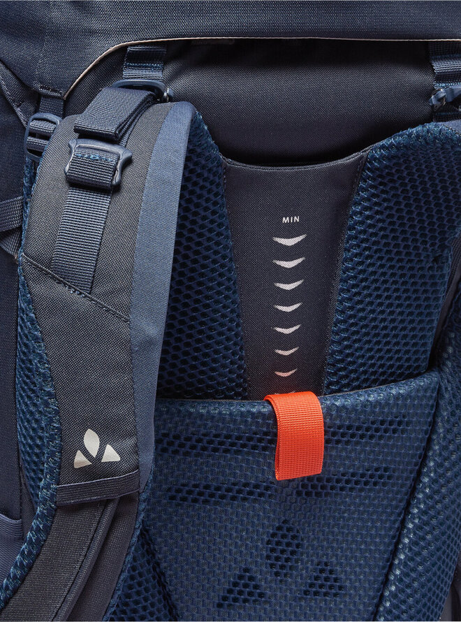 - bočné kompresné popruhy, horný kompresný popruh s všestrannou opravnou prackou, jeden bod uchytenia palice, pútka na vybavenie, pripevňovacie pútka na veku, otvor pre hydratačný systém, hrudný popruh s píšťalka, informačný panel pre osobné údaje