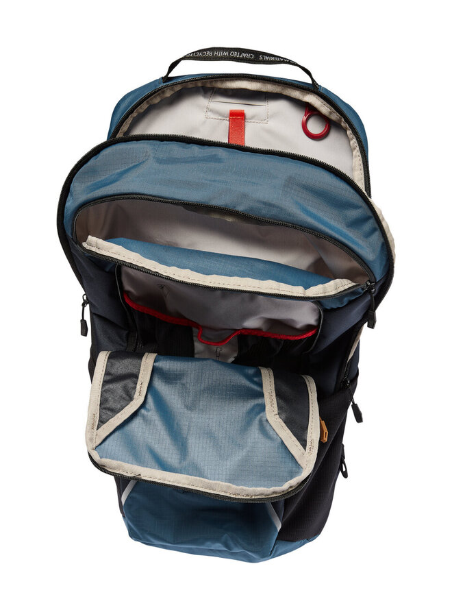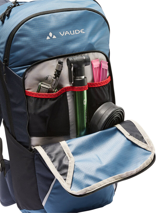 - samostatná priehradka v hornej časti, priehradka na náradie so sieťovými vreckami, bočné sieťové vrecká, bedrové vrecko