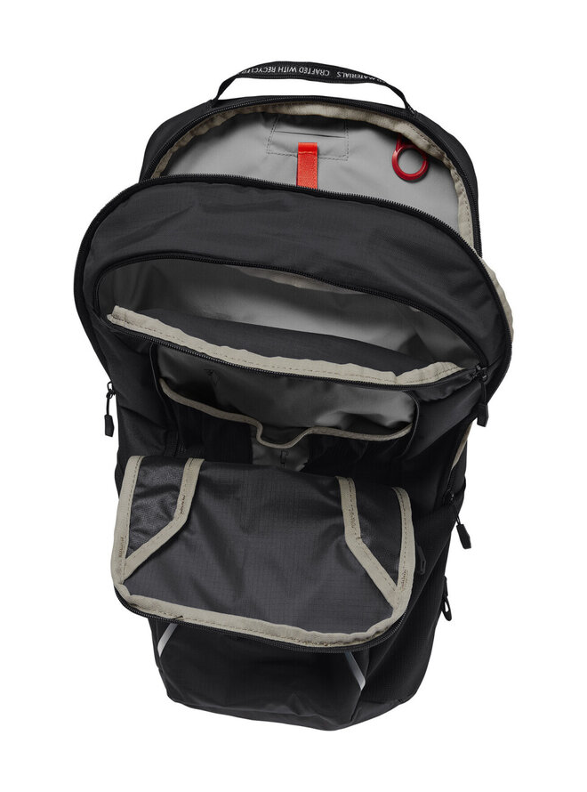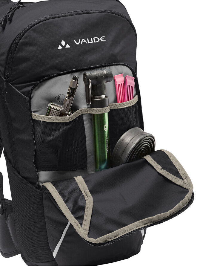 - samostatná priehradka v hornej časti, priehradka na náradie so sieťovými vreckami, bočné sieťové vrecká, bedrové vrecko