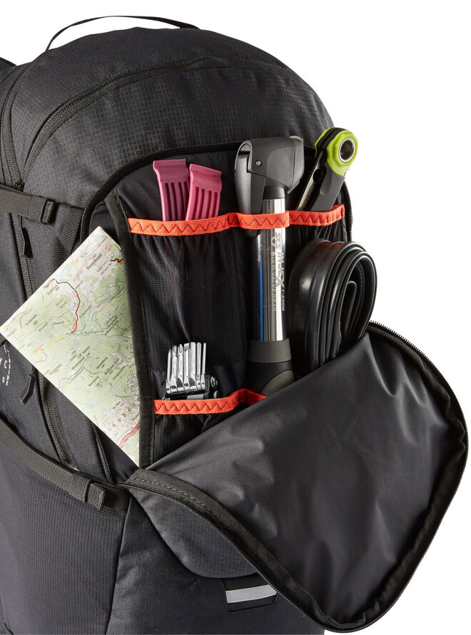- batoh je rozdelený na tri priehradky. Veľká hlavná priehradka sa dá rozdeliť pre lepšiu organizáciu oblečenia a jedla a ponúka samostatný prístup zhora alebo zdola, pred ním je ďalšia priehradka na okuliare alebo peňaženku, priehradka na náradie v prednej časti, pod ním je miesto pre mapy alebo iné dokumenty, má tiež skrytú priehradku s držiakom na prilbu