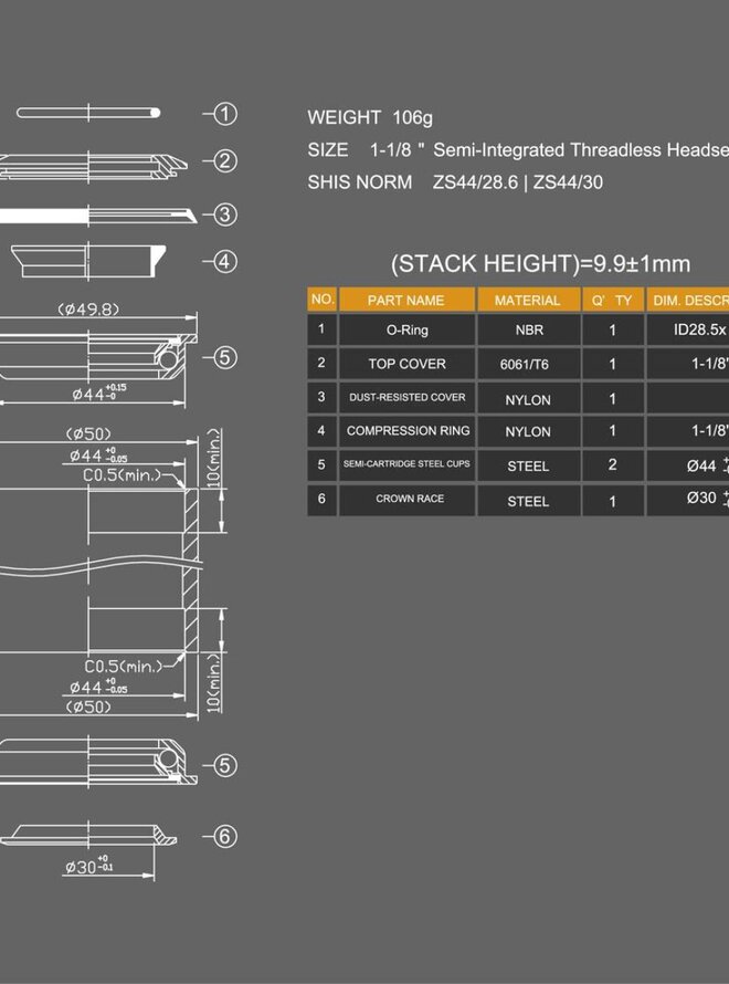 Hliníkové polointegrované hlavové zloženie s oceľovými prvkami určené pre vidlice s 1-1/8" (28,6 mm) krkom bez závitu. Guľôčkové ložiská poskytujú dostatočne hladký chod a sú ľahko servisovateľné. Súčasťou balenia je horný kryt so skrutkou a ježkom. Materiál: Horné misky: Hliník 6061/T6 CNC opracované, Spodné misky a korunka: Oceľ Výška: 9,9 ± 1mm Veľkosť: 1-1/8", polozapuzdrené misky d=44 mm Rozmery: 1-1/8" x 44/50 x 30 Ložiská: Venčeky 5/32" x 22 Váha: 106gDetaily
