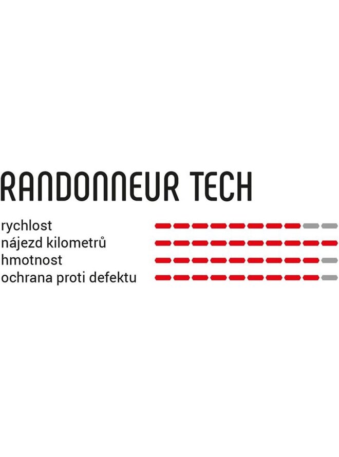 RANDONNEUR TECH Vďaka nízkemu valivému odporu a maximálnej (dvojitej) ochrane proti prerazeniu je táto pneumatika ideálnym spoločníkom do mesta alebo na náročné túry či cestovanie. Pneumatika spĺňa normu ECE-R75, a preto je dostatočne odolná na montáž na elektrobicykle. Bezpečnosť okrem dvojitej ochrany proti prepichnutiu zvyšuje aj reflexná bočnica. Drôtená pätka Konštrukcia kordu NYLON 33 TPI Dvojitá ochrana proti prepichnutiu pod behúňom Grafénová zmes zvyšuje odolnosť, predlžuje životnosť a tiež zvyšuje priľnavosť - najmä za mokra Reflexná bočná stenaDetaily