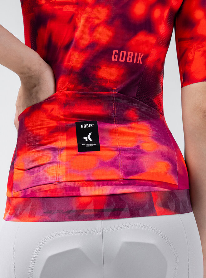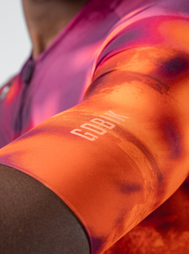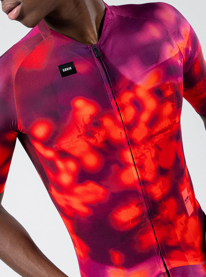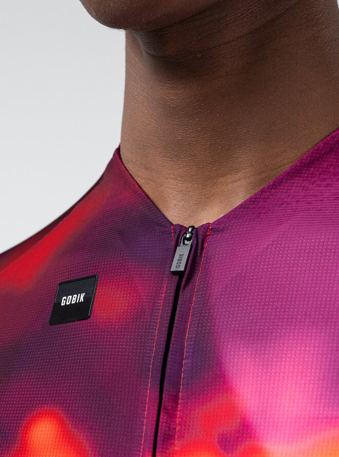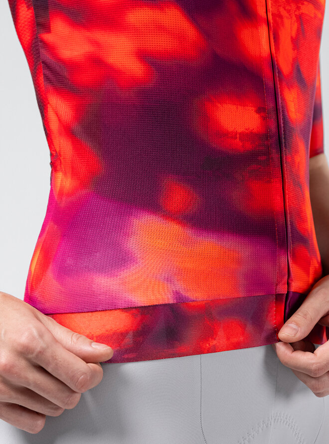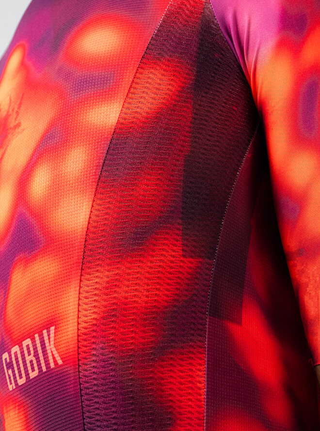 Predná časť využíva rovnaký mikroperforovaný materiál ako zadná, čím podporuje nepretržité prúdenie vzduchu a pomáha udržiavať telo svieže a suché. Rukávy s čistým strihom bez švov eliminujú trenie a presne sa prispôsobujú, čím zvyšujú stabilitu a aerodynamiku bez straty komfortu.