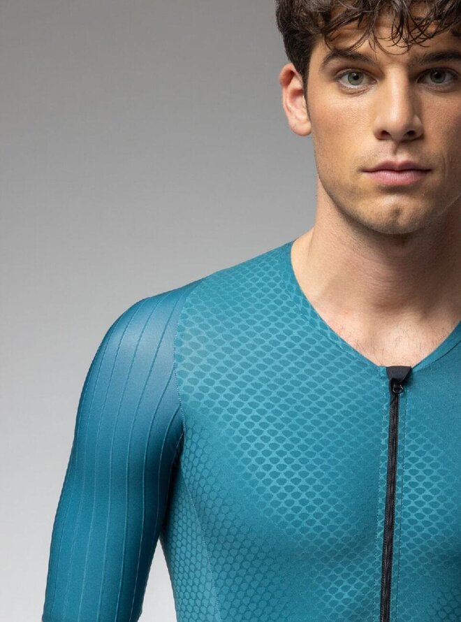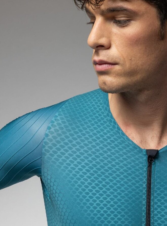 Rukávy s raw-cut zakončením z 3D štruktúrovanej tkaniny s kanálikmi podporujú plynulý pohyb a optimálne prúdenie vzduchu. Kalhotová časť s minimom švov zaisťuje účinnú kompresiu, stabilitu a spoľahlivú svalovú oporu po celú dobu závodu.