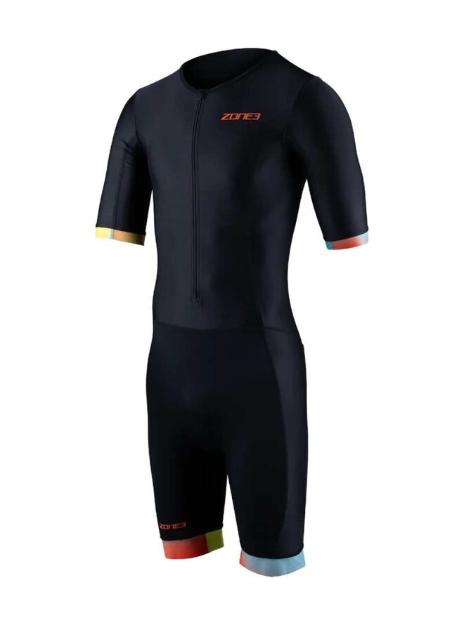 Pánsky Activate+ Short Sleeve Trisuit od značky Zone3 je vysoko výkonný triatlonový overal s krátkym rukávom, navrhnutý pre trénerské aj pretekárske použitie. Tento jednodelný trisuit kombinuje komfort, aerodynamiku a moderný dizajn, pričom umožňuje maximálnu voľnosť pohybu pri plávaní, cyklistike a behu. Ergonomický strih poskytuje priliehavé a pohodlné sedenie, zatiaľ čo zadné a bočné panely z ľahkej sieťoviny (mesh) zlepšujú priedušnosť a odvod potu. Trisuit je vybavený Tri‑Lite vložkou, ktorá poskytuje ochranu pri cyklistike, rýchlo schne a nebráni pri plávaní či behu. Elastické silikónové leg grippers zabezpečujú stabilné usadenie nohavíc bez posunu a ploché švy minimalizujú trenie a podráždenie pokožky.Detaily