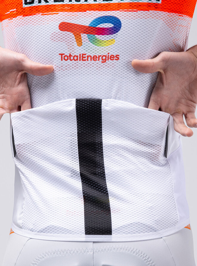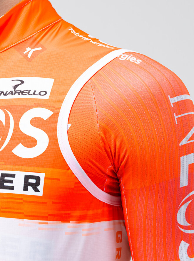 Ľahké, aerodynamické a vetruodolné, navrhnuté tak, aby maximalizovali funkčnosť na ceste. Jeho konštrukcia ho umožňuje úplne zložiť do vlastného bočného sieťovaného vrecka, pričom zaberá minimálny priestor a uľahčuje prenášanie na akúkoľvek jazdu. Nový optimalizovaný vzor zlepšuje padnutie a zaisťuje dokonalú integráciu cez dres bez toho, aby spôsoboval nepohodlie alebo obmedzenia. Vyznačuje sa prepracovanými zadnými otvormi, ktoré umožňujú rýchly a jednoduchý prístup k vreckám dresu, dokonca aj počas pohybu. Poskytuje účinnú ochranu pred vetrom pre hrudník a oblasť jadra, čo je obzvlášť užitočné v skorých ranných hodinách dňa alebo počas dlhých zjazdov. Všestranný spojenec na rozšírenie tepelného rozsahu dresov s dlhým rukávom a udržiavanie telesnej teploty v meniacich sa podmienkach. Optimalizovaný aerodynamický strih. Predný panel vyrobený zo štruktúrovanej tkaniny odolnej voči vetru. Zvýšený golier s elastickou zadnou časťou. Zadný panel zo sieťoviny. Optimálny strih na ramenách. Utesnený dvojitý zips YKK. Bočné sieťované vrecko. 2 prístupové otvory do vreciek dresu. Reflexné detaily.Detaily