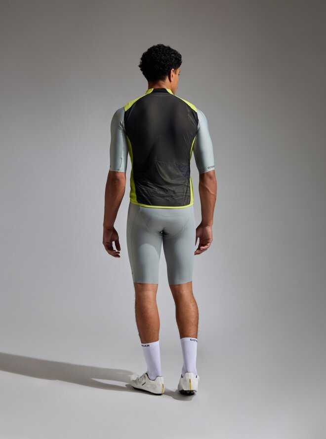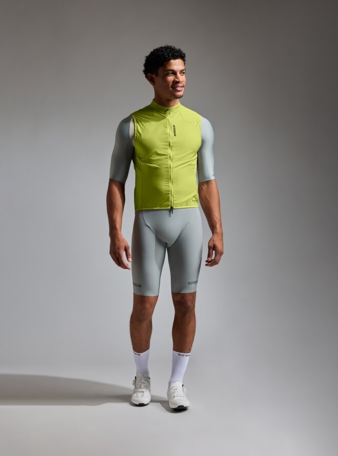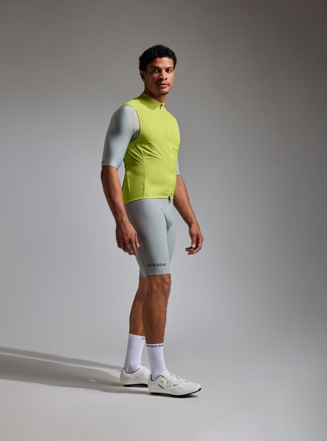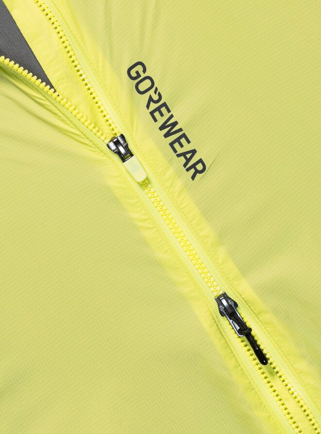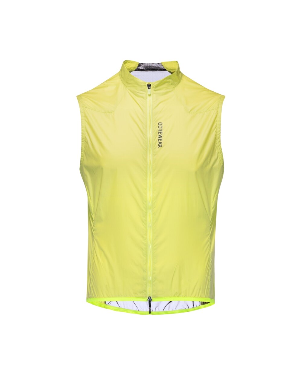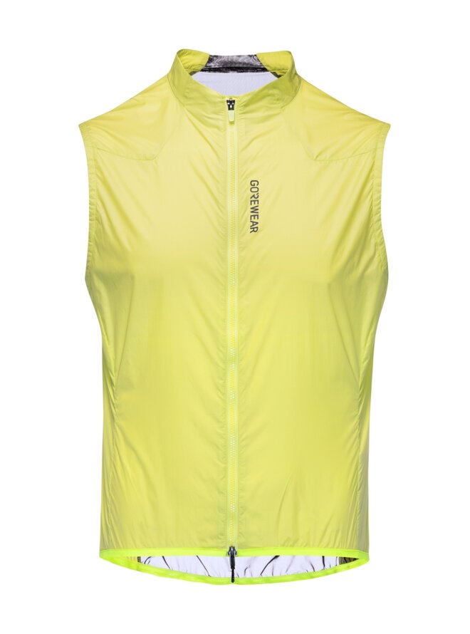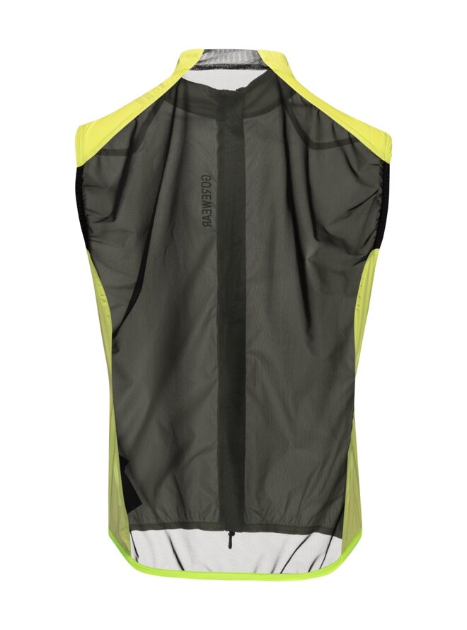 Predná časť vesty účinne chráni stred tela pred vetrom vďaka kvalitnej povrchovej úprave, zatiaľ čo zadný panel zo sieťoviny zabezpečuje výbornú priedušnosť a priliehavý strih. Vysoký golier poskytuje dodatočnú ochranu pred chladom a vetrom.