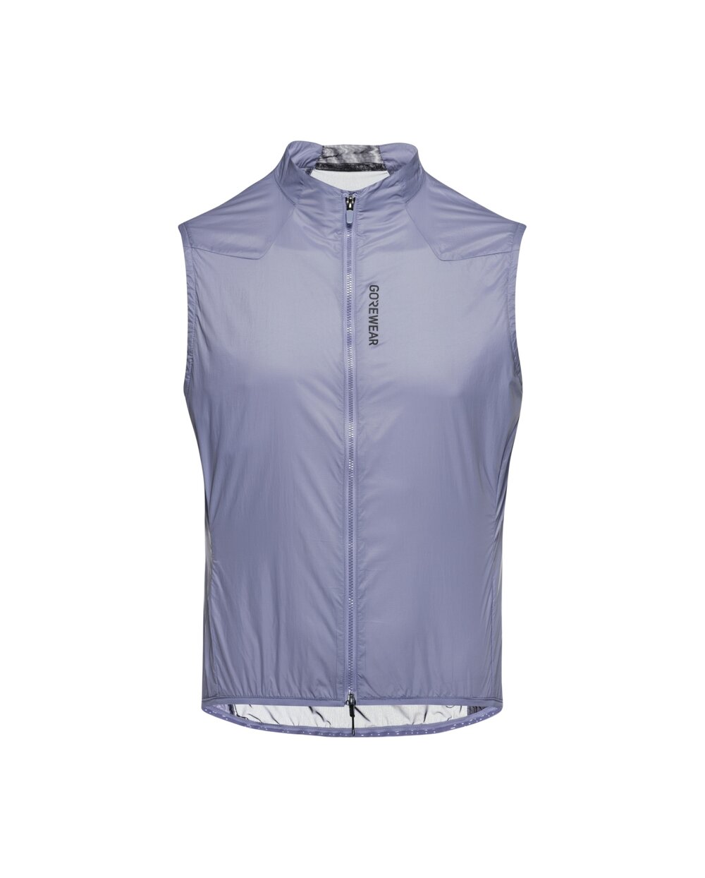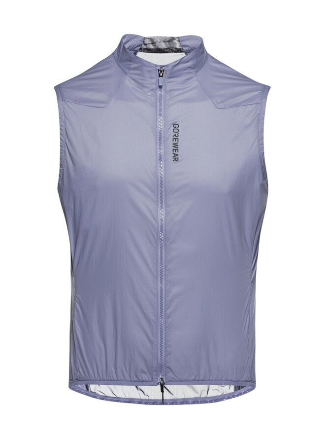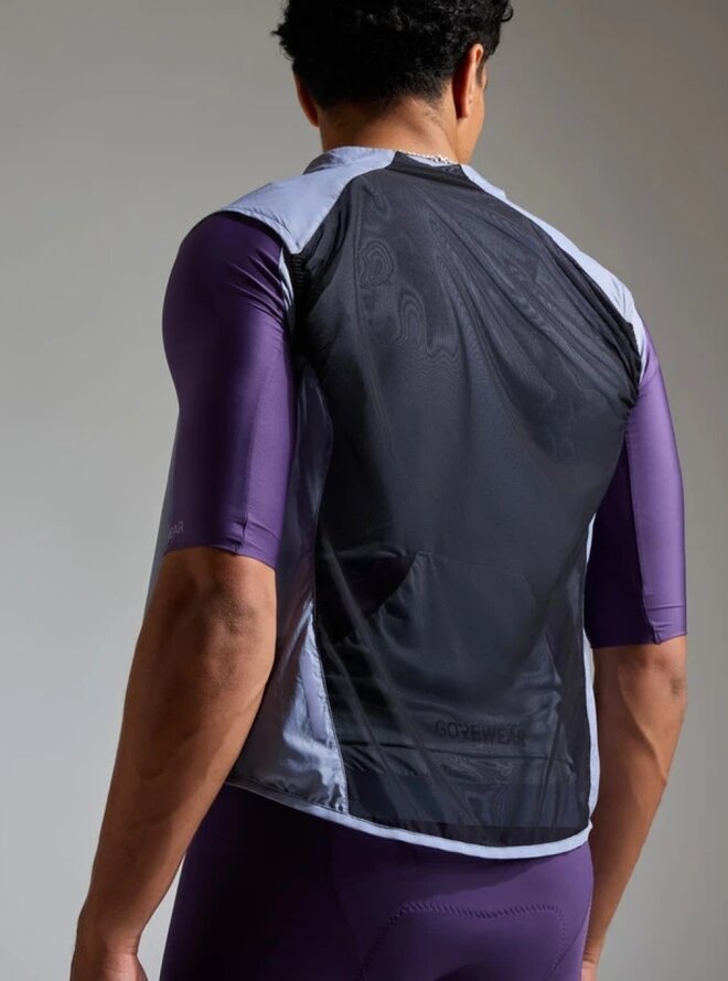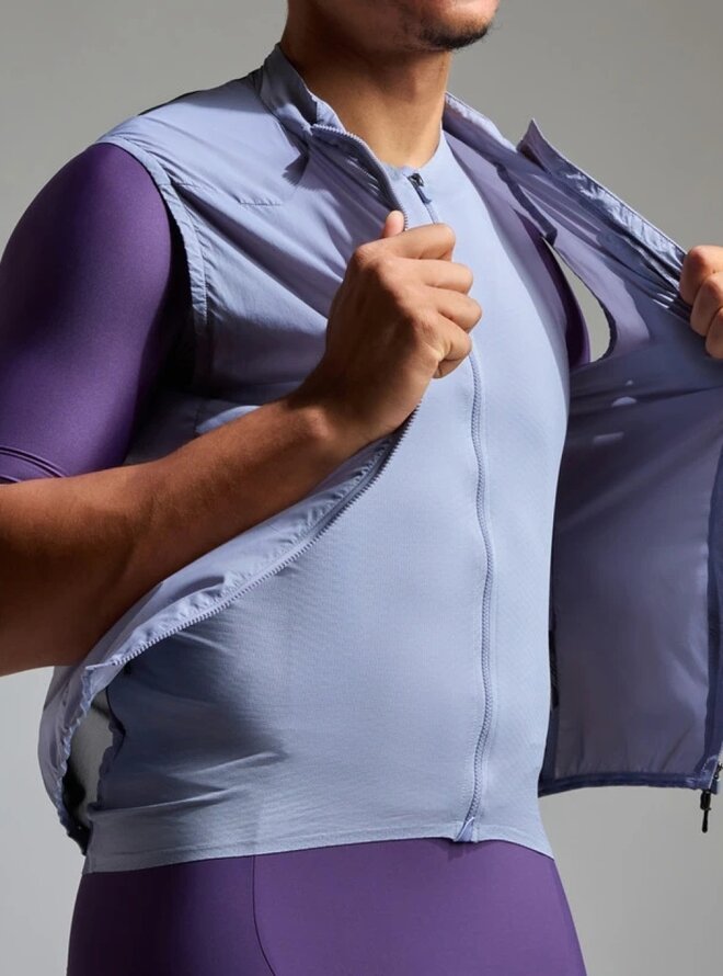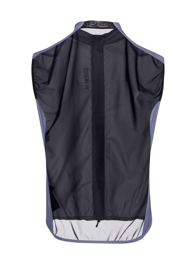 Predná časť vesty účinne chráni stred tela pred vetrom vďaka kvalitnej povrchovej úprave, zatiaľ čo zadný panel zo sieťoviny zabezpečuje výbornú priedušnosť a priliehavý strih. Vysoký golier poskytuje dodatočnú ochranu pred chladom a vetrom.
