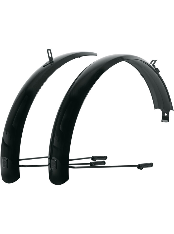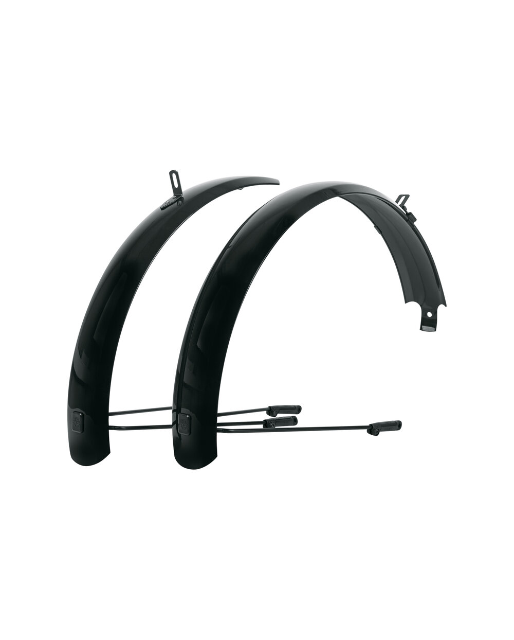 SKS Bluemels Basic je sada blatníkov vyrobená z robustnej sendvičovej konštrukcie. Ich lesklý dizajn vie zaujať, spoľahlivo chráni pred nečistotami a striekajúcou vodou. Vďaka flexibilnej sendvičovej konštrukcii, v ktorej sú ultrajemné hliníkové pásy zapustené do plastového povlaku, sú blatníky extrémne robustné, tuhé a odolné proti korózii. Slúžia ako vynikajúca ochrana vďaka montáži tesne pri plášti. Či už na poľných cestách alebo lesných cestách, blatníky BLUEMELS Basic ponúkajú vynikajúcu všestrannú ochranu. Bezpečnostný systém ESC odpojí vzpery v prípade zachytenia vetiev medzi špice kolesa, aby sa koleso nemohlo zaseknúť.