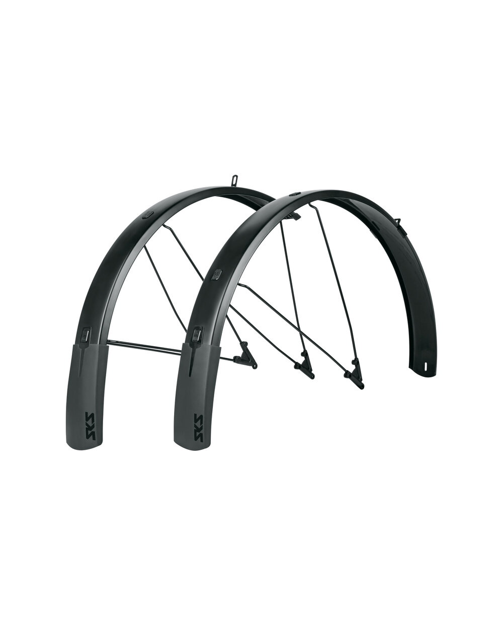 SKS Bluemels Style je sada blatníkov s ohybným spojlerom, ktorý ponúka vynikajúcu všestrannú ochranu proti striekajúcej vode. Vďaka flexibilnej sendvičovej konštrukcii, v ktorej sú ultrajemné hliníkové prúžky zasadené do plastového povlaku, je blatník extrémne robustný, tuhý a odolný proti korózii. Model má nový V-adaptér s bezpečnostným systémom ESC, ktorý odpojí dvojité U-vzpery, pokiaľ by sa medzi špice zachytili konáre. Vďaka tomu by sa koleso nemalo zaseknúť. S čiernym matným povrchom a čiernymi upevňovacími prvkami pôsobia blatníky jednotným dizajnom a vynikajú aj po vzhľadovej stránke.