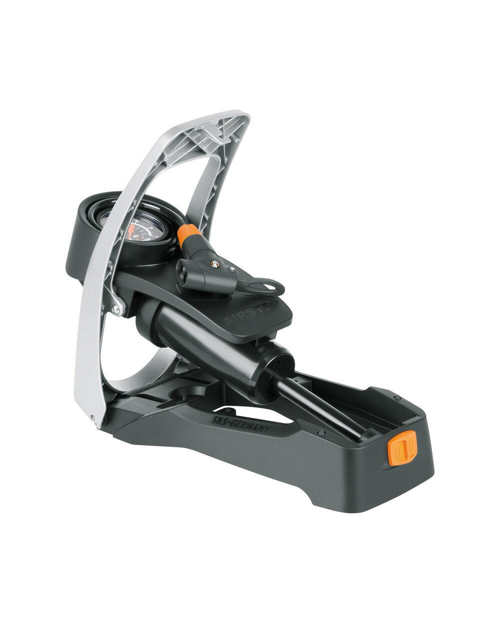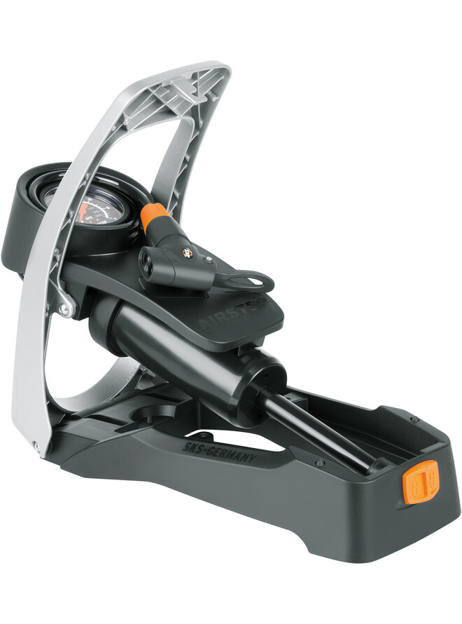 Nožná pumpa SKS Germany AirStep kombinuje vlastnosti klasickej pumpy a najnovšie technológie Made in Germany. Prvotriedny materiál najvyššej kvality, koncept konštrukcie a užívateľsky prívetivé funkcie (veľký manometer, integrovateľná špirálová hadica s ventilkovou hlavicou pre všetky druhy ventilčekov) dávajú pumpe úplne nový a inovatívny vzhľad. Ergonomický robustný hliníkový nožný pedál umožňuje maximálne možné natlakovanie 7 bar/102 PSI bez ťažkostí. Nahustenie nebolo nikdy tak jednoduché a šetrné pre váš chrbát. Po nafúkaní je pedál stlačený a tlačidlom zaistený pre úsporu miesta. Je aj možnosť zavesenia vďaka priloženému nástennému držiaku.