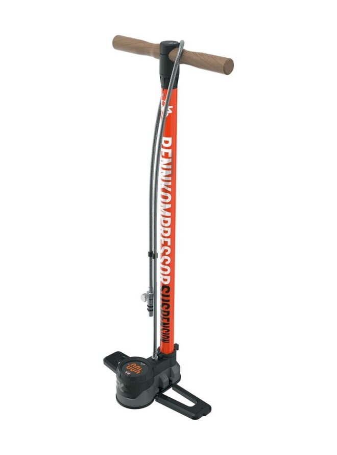 Rennkompressor Suspension zaručuje maximálny výkon pri nastavovaní tlaku vzduchu v odpružení a pružinových prvkoch. Verzia Suspension osvedčeného modelu Rennkompressor NXT zaujme profesionálnych mechanikov aj ambicióznych domácich nadšencov. S tlakom až 400 PSI poskytuje vynikajúci tlak pre tlmiče a odpružené vidlice, zatiaľ čo digitálny vysokotlakový manometer garantuje najvyššiu presnosť merania. Pre presné doladenie je možné tlak vzduchu upravovať pomocou drážkovaného šróbu. Spojenie so Schrader ventilom s dvojstupňovým skrutkovacím uchytením zabraňuje úniku tlaku pri pripájaní a odpojovaní a zabezpečuje bezpečnú manipuláciu. Pumpa má dlhú, pogumovanú hadicu so oceľovým opletením. Je nápadná, no stabilná: vysokotlaková hadicová pumpa s charakteristickou červenou kovovou trubkou je ľahko rozpoznateľná a protišmyková liata hliníková základňa zaručuje stabilitu. Extra dlhá pogumovaná hadica so steel-opletením poskytuje dostatok voľnosti pohybu, najmä keď je bicykel zavesený na stojane. Obzvlášť praktické sú skladacie nožičky a odnímateľná drevená rukoväť, ktoré umožňujú úsporné uloženie pumpy v dielni.Detaily