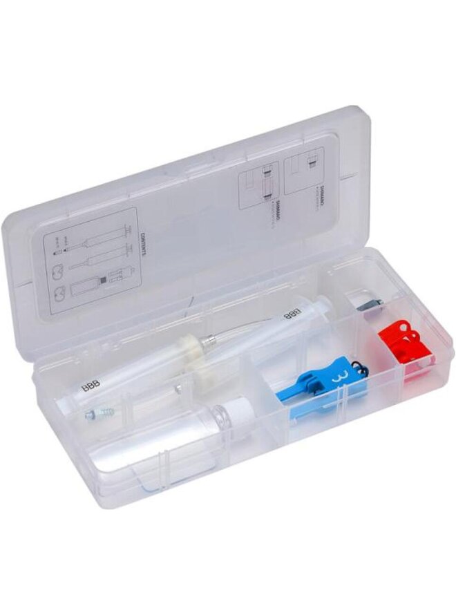 Sada na plnenie a odvzdušňovanie kotúčových bŕzd.Určená pre cestné i MTB brzdy Shimano.Vhodná pre minerálny olej.Obsah: 3 striekačky, fľaštička, hadičky, adaptéry a uzatváracie klipy.Detaily