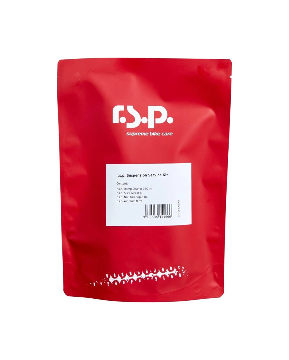 RSP servisná sada na odpruženie (vidlice a tlmiče), ktorá obsahuje 250 ml plne syntetického oleja „Damp Champ“ s viskozitou 5 wt, mazivo „Slick Kick“ (8 g), aditívum „No Stick Slip“ (8 ml) a mazivo „Air Fluid“ (8 ml). Sada je navrhnutá na zníženie trenia a peniacich procesov v pružení a zabezpečuje hladký, spoľahlivý chod odpruženia aj pod tlakom.Detaily