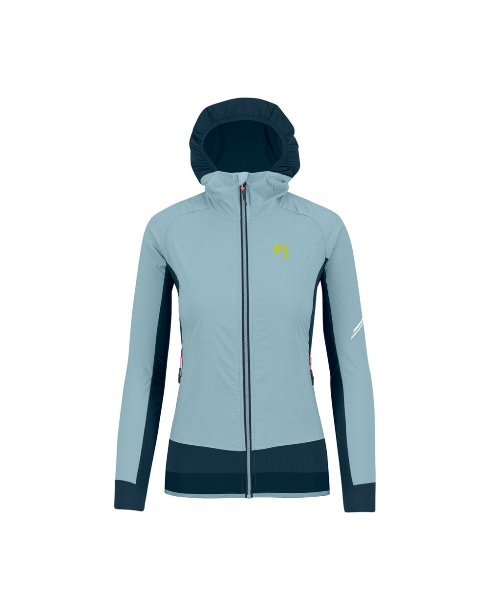 - Predná časť bundy a predné časti rukávov sú vyrobené z vetruodolnej látky, ktorá je ošetrená vodoodpudivou úpravou DWR. Tieto časti sú špeciálne navrhnuté tak, aby regulovali prúdenie vzduchu, čím zvyšujú priedušnosť a komfort pri aktívnom pohybe.