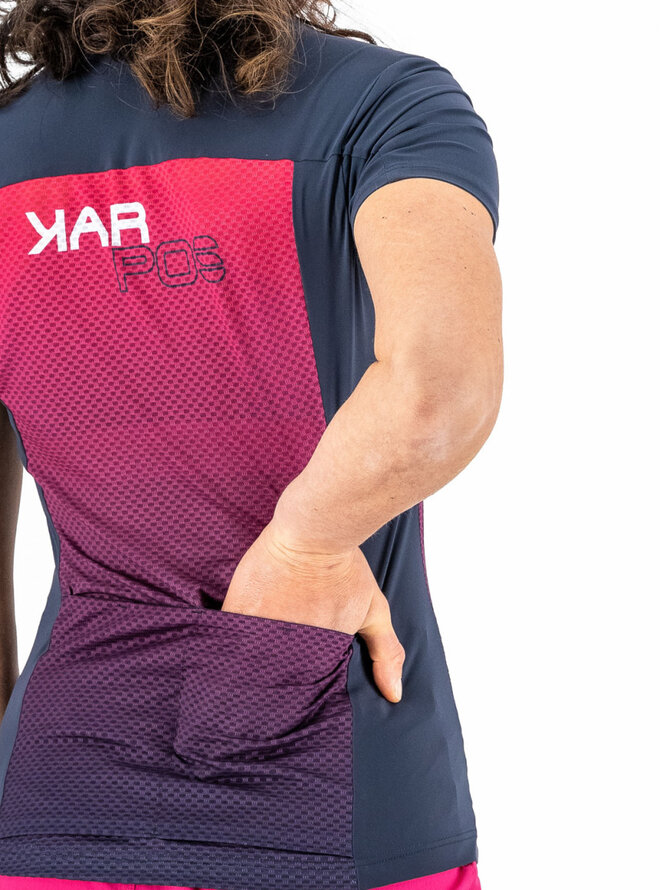 Dámsky dres na horskú cyklistiku Karpos Verve Evo je vyhotovený z dvojice funkčných materiálov, ktoré poskytujú optimálny komfort aj počas celodenných výletov. Na bokoch, ramenách a rukávoch sa nachádza hebký, elastický materiál, ktorý výborne chladí a zaisťuje priliehavé sedenie. Lepšiu priedušnosť a odvádzanie potu od pokožky zabezpečuje dierkovaný materiál na prednej a zadnej strane. Pre odloženie si všetkých, potrebných vecí je dres v zadnej časti vybavený 2 vreckami a reflexným logom.