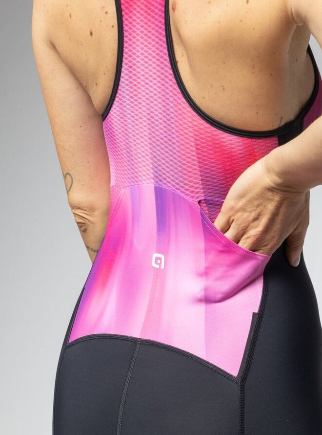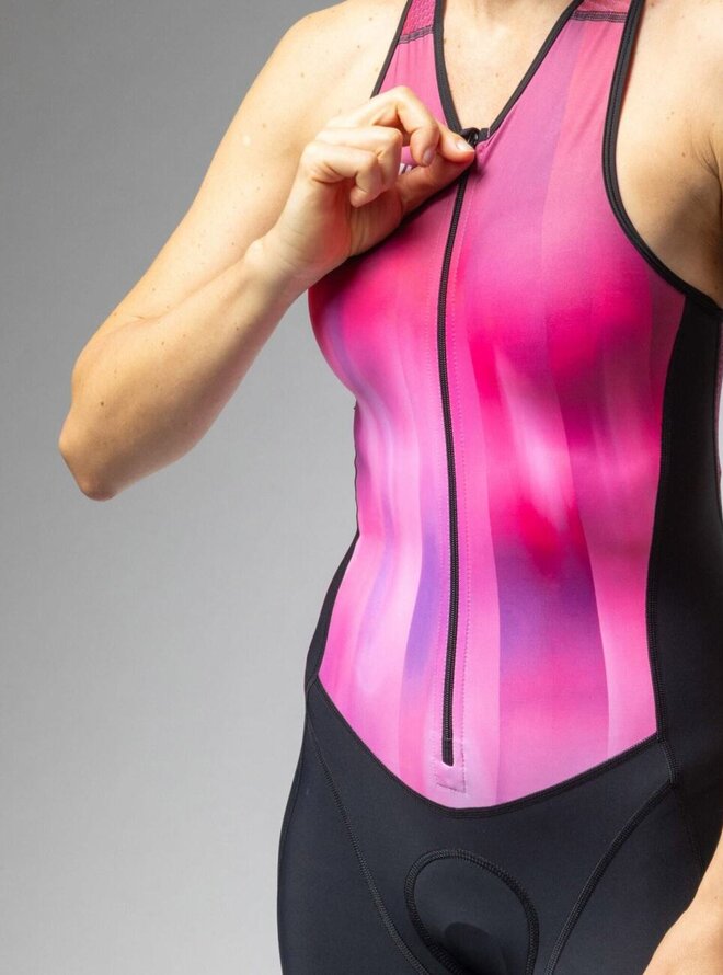 Bezrukávová triatlonová kombinéza "Skinsuit" Crazy Lady je navrhnutá pre krátke intenzívne plavecké tréningy a rýchle úseky. Anatomický strih, odľahčená konštrukcia a ultraľahké materiály s hydrofóbnou úpravou odpudzujú vodu bez jej nasiakania, čím znižujú odpor aj hmotnosť. Tenký materiál navyše zaisťuje priliehavý „second-skin“ efekt pre maximálnu efektivitu vo vode.- Závodný strih