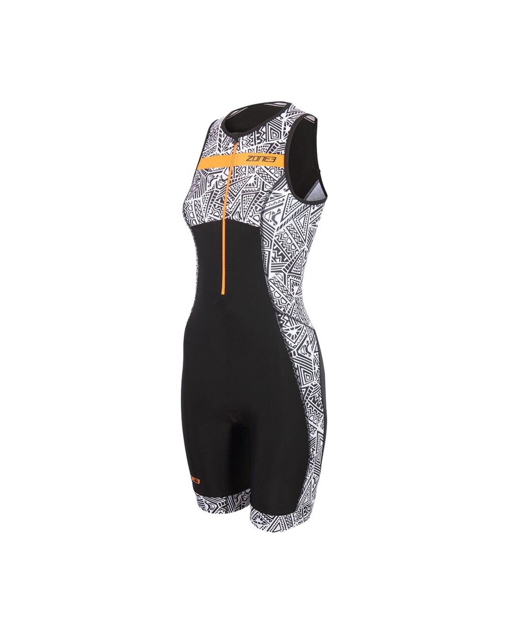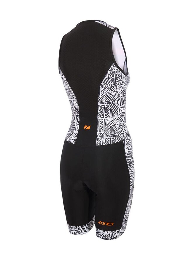 Dámska Zone3 Activate+ Kona Speed Sleeveless Trisuit v modernom čierno-bielom dizajne s oranžovými detailmi je všestranný a výkonnostne ladený oblek určený pre triatlonistky, ktoré chcú maximálnu voľnosť pohybu a priedušnosť počas každej disciplíny. Tento model kombinuje elegantný športový vzhľad so špičkovou funkčnosťou materiálov, ktoré efektívne odvádzajú pot a rýchlo schnú, čo veľmi oceníš najmä počas náročných tréningov a pretekov v teplejšom počasí. Vrchná časť a panely na nohách sú vyrobené z vysoko elastickej Lycra Sport tkaniny, ktorá zaisťuje pohodlné priliehanie, dobré krytie a podporu bez nepríjemného ťahania alebo presvitania. Zadná časť je doplnená ľahkým a vysoko elastickým „waffle“ panelom, ktorý maximalizuje priedušnosť a komfort počas behu či jazdy na bicykli. Detaily ako predný zips umožňujú jednoduchú reguláciu ventilácie počas výkonu. Tri-suit je navrhnutý s Tri-lite vložkou pre zvýšené pohodlie pri cyklistike bez obmedzenia pri behu či plávaní a silikónovými gripmi na nohách, ktoré udržujú kombinézu na mieste aj pri dynamických pohyboch. Praktické elastické zadné vrecko poskytuje úložný priestor na výživu alebo drobné osobné veci počas pretekov. Vďaka svojej bezrukávovej konštrukcii je tento trisuit ideálny pre teplejšie ročné obdobia, najmä jar a leto, keď je dôležité udržiavať nízku hmotnosť a maximálne prúdenie vzduchu bez kompromisov v aerodynamike či pohodlí.Detaily