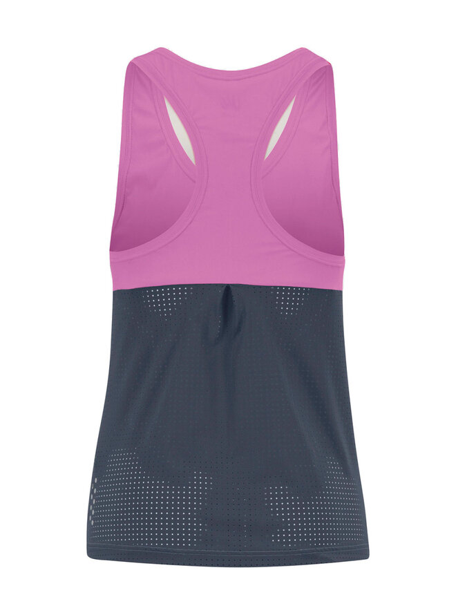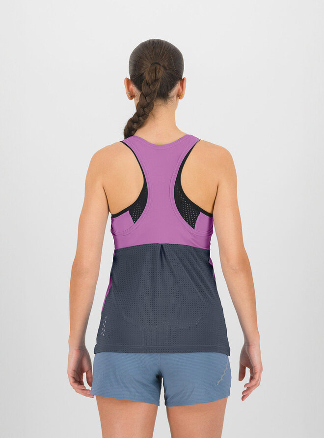 Minimalistický dizajn s premyslenou konštrukciou zabezpečuje maximálnu priedušnosť a voľnosť pohybu. Predný diel z hladkej elastickej tkaniny jemne obopína postavu bez zbytočného tlaku, zatiaľ čo perforovaný zadný panel zaisťuje efektívnu ventiláciu aj počas horúcich dní a výkonnostných maxím.