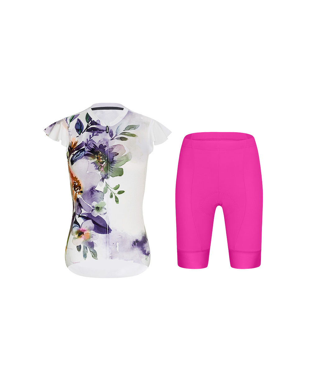 Cyklistický krátky dres a krátke nohavice - MISS FLOWERY - cyklamenová/biela/viacfarebná